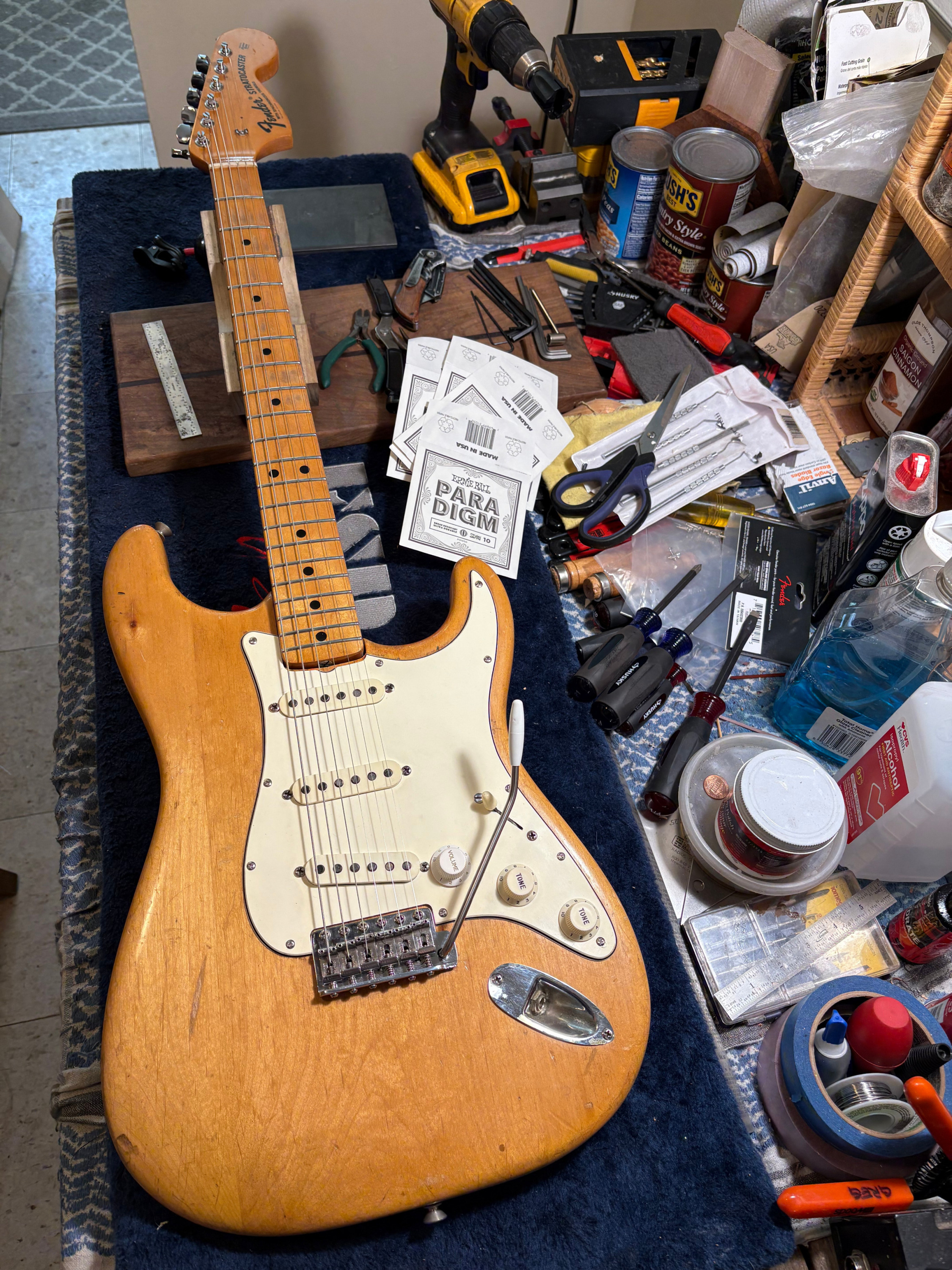 Includes scraping and sanding the fretboard; removing all hardware and pickguards to clean underneath; cleaning electronic components to improve longevity and remove scratchy sounds; rust removal and mitigation for metal parts; polishing and oiling all hardware including tuners. (Only available in conjunction with a Basic Setup or a Full Fret Level and Dress.)